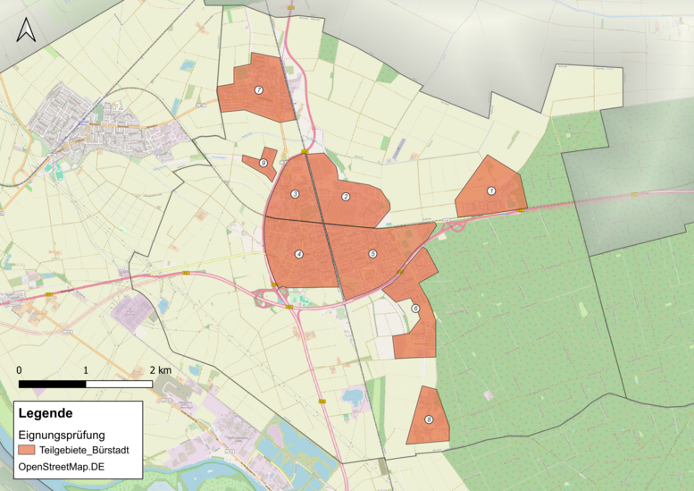 Aus dem Ergebnis der Eignungsprüfung ergibt sich, dass für alle Teilgebiete in der Stadt Bürstadt eine "normale" und nicht verkürzte Wärmeplanung durchgeführt wird. Dadurch kommt allen Teilgebieten eine genaue Betrachtung auf Ebene der kommunalen Wärmeplanung zuteil, sodass Bestands- und Potenzialanalyse in vollem Umfang über alle Teilgebiete erfolgt, um eine bestmögliche Ausgangslage für die Entwicklung des Zielszenarios zu ermöglichen. Dies dient vor allem auch der Transparenz und der Gleichbehandlung aller Teilgebiete auf der Gemarkung Bürstadt, Bobstadt und Riedrode.